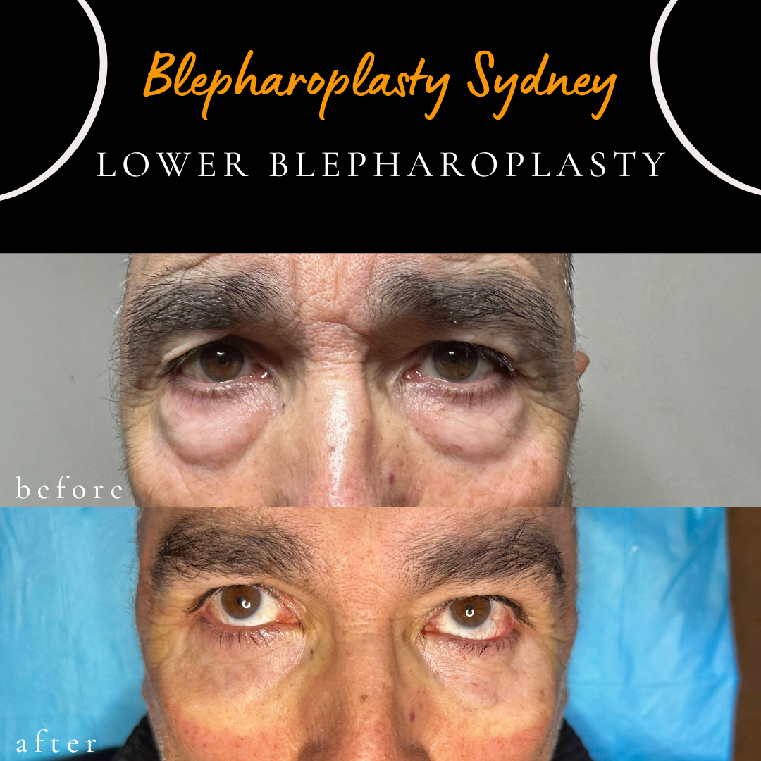 This image shows a patient immediately after lower eyelid blepharoplasty to address lower eyelid fullness. The procedure may be performed under local anaesthesia, where clinically appropriate. In this case, an internal (transconjunctival) approach was used, which avoids an external skin incision. Individual healing and results vary.
