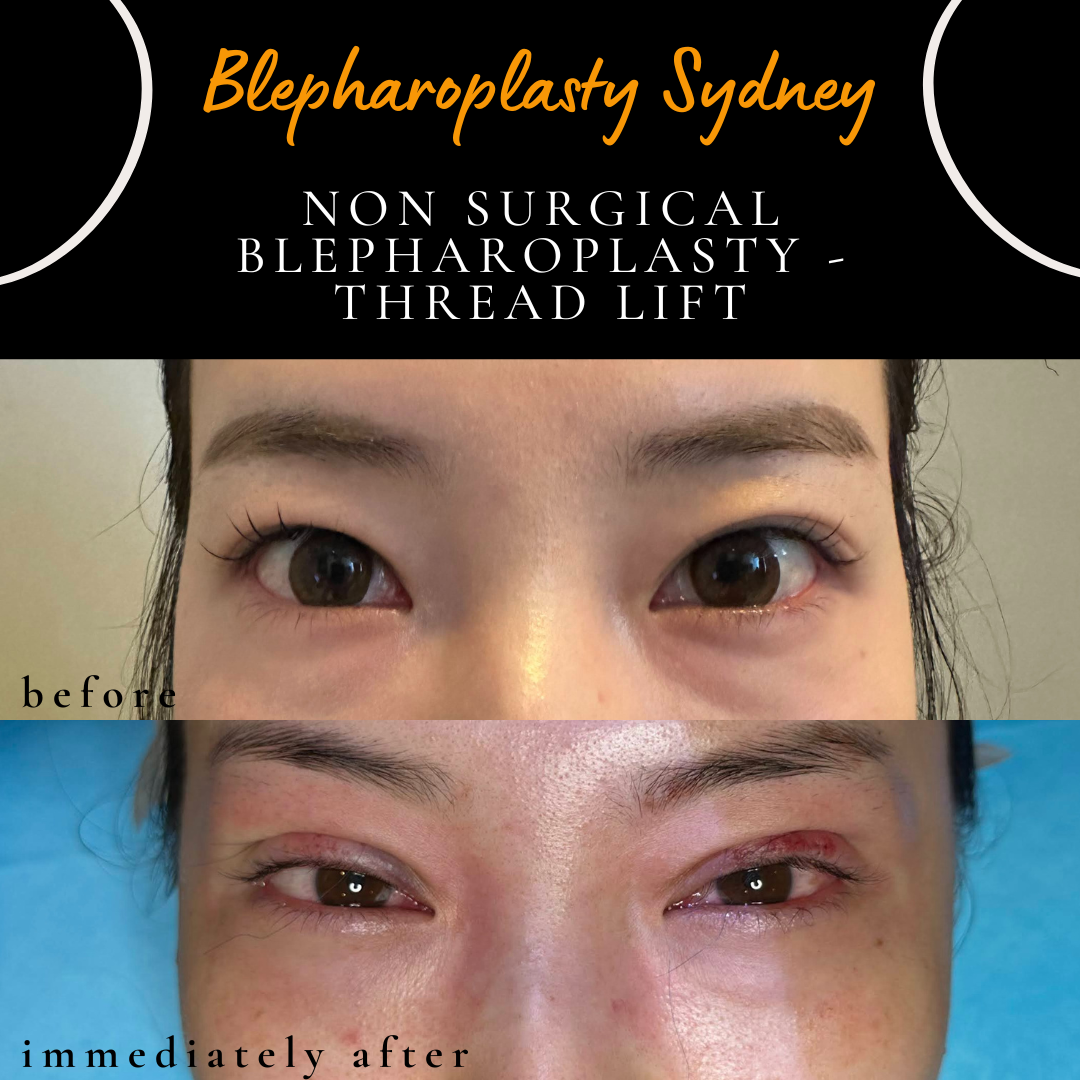 The image was taken immediately after a non-surgical upper eyelid thread lift, performed to support and reposition upper eyelid tissue. Procedure duration varies depending on individual clinical factors. Individual healing and results vary.